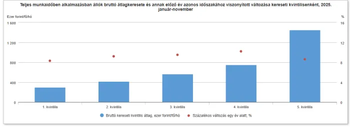 Ha a foglalkoztatottakat öt csoportba osztjuk, akkor a legtöbbet és legkevesebbet keresők esetében nőtt legkisebb mértékben, 8,6, illetve 8,3 százalékkal a bruttó átlagkereset a 2025. január-novemberi időszakban. A havi bruttó átlagkereset így az első tíz hónapban a legtehetősebbeknél 1 451 000 forint, míg a legkevesebbet keresőknél 295 000 forint volt. Ez csaknem ötszörös különbség.