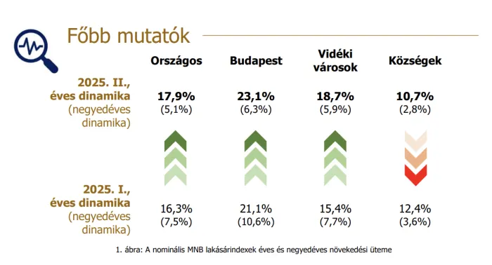 A Magyar Nemzeti Bank (MNB) 2025. második negyedéves lakásárindexe alapján éves szinten 17,9 százalékos növekedést produkált országosan az ingatlanpiac, de az ütem az előző negyedévhez mérten is jelentős, ugyanis 5,1 százalékkal emelkedtek az árak az év első három hónapjához képest.