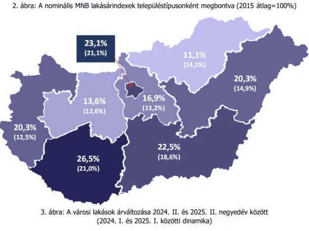 Ezzel éles ellentétben áll Észak-Magyarország, ahol negyedéves alapon még árcsökkenést is mértek (−1,9%). Ez az adat arra utal, hogy a gyengébb munkaerőpiac, az elmaradó beruházások és a lehetőségek hiánya akadályozza az általános fellendülés lakáspiaci hatását a gazdaságilag fejletlenebb területeken.